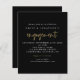 Invitation Fiançailles Noir Simple Script Gold. Un prix économique PETIT 4,5 po x 5,6 po alternatif. Disponible dans un STOCK CARTE SEMI GLOSS 110 lb qui est l'option par défaut (recommandé pour les invitations), OU un STOCK PAPIER THINNER SATIN FINISH 80 lb (idéal pour les boîtiers). Les enveloppes sont en option et légèrement plus grandes que la taille de la carte. minimalisme moderne en noir classique avec typographie or et blanc. Le fiançailles est aménagé dans un style moderne d'écriture manuscrite. Personnalisez facilement le reste du texte à vous.