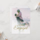 Une simple photographie avec un script moderne et élégant annonçant votre fiançailles au-dessus du haut. La photo est facilement changée en votre propre photo personnelle. Le texte à l'envers est facilement changé pour vous et est sur un arrière - plan blanc. La photo sur le dos peut être échangée contre la vôtre et elle apparaîtra aussi s'estomper.
