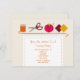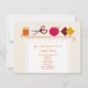 Une invitation de couture de partie comportant des illustrations au sommet d'une bobine de fil orange, de ciseaux, d'un coussin de goupille, et des échantillons de tissu. Personnalisez le texte au-dessus de la section blanche avec l'équilibre orange de point.