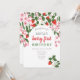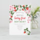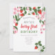 Joli, floral rose et rouge, été, invitation moderne pour le 1er anniversaire de bébé-fille avec des fraises.