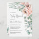 Une invitation de baby brunch féminine et élégante présentant un bouquet dans le coin de coquelicots aquarelles, de roses, d'eucalyptus et de verdure retombante dans des tons pastel beige, rose, vert et vert-bleu. Les associations de polices tendance comprennent un script manuscrit et un élégant serif. Il y a un texte spécial au dos de l'invitation avec une demande "Livres pour bébé". Cette invitation est un excellent choix pour la future maman qui attend une petite fille. Personnalisez le modèle de texte facile à utiliser avec vos informations d'événement.