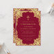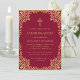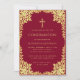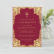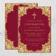 Cette élégante invitation de confirmation bordeaux et or avec une atmosphère vintage, recommandée pour une fille, possède un cadre orné en faux feuillet d'or avec des branches sinueuses aux feuilles dorées sur fond bordeaux. Au-dessus du texte, il y a une croix religieuse en faux feuillet d'or. Tout le texte peut être personnalisé et a une couleur jaune doré similaire au cadre en faux or.