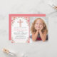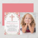 Élégante invitation de première communion avec un fond blanc simple qui peut être changé en n'importe quelle couleur, une photo de votre enfant, une jolie croix religieuse florale aquarelle, confettis dorés et un modèle moderne facile à personnaliser.