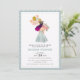 Ce design d'invitation à la fête de remise de diplômes comprend une aquarelle d'une fille aux cheveux violets avec une robe bleue et une casquette de remise de diplômes tenant des ballons, des fleurs et son diplôme roulé.