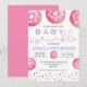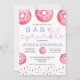 Cette fête de bébé personnalisable présente des donuts roses à l'aquarelle avec des paillettes. Les couleurs sont parfaites pour une fête de bébé fille.