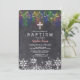 Design élégant et unique avec des flocons de neige blancs, des lumières à cordes colorées, sur arrière - plan de tableau noir. Utilisez l'outil Personnaliser pour ajouter vos informations, modifier la couleur de police. Pour les articles correspondants, veuillez visiter ma collection de célébrations Baptême/Christening .