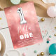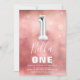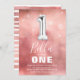 Invitation moderne de fête de premier anniversaire conçu avec un arrière - plan rose d'eau sombre, confetti de bulle transparente, et un grand ballon d'hélium numéro un en argent. Le nom de l'enfant est écrit en gros texte calligraphie blanc avec un simple modèle d'anniversaire en dessous qui est facile à customiser.