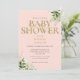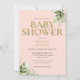 Une élégante invitation à une baby shower avec une typographie dorée élégante et un beau feuillage botanique verdoyant sur un fond rose blush. Conçu par Thisisnotme©