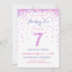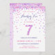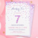 Fêtez l'anniversaire de votre enfant de 7 ans avec des confettis colorés rose et violet sur ces invitations d'anniversaire de 7 ans ! Avec les détails de la fête de votre fille et un "7" en confetti. Le dos a un design confetti avec une couleur lavande douce. Ce design adorable est super mignon et girly - et parfait pour la fille qui aime le rose et le violet!