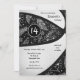 Cette invitation de célébration de basket-ball mignonne comporte l'image réaliste d'un ballon de basket stylisé abstraitement surdimensionné qui a des panneaux alternés noirs et blancs recolorés - un motif de doodle de paisleys, fleurs et plumes en blanc couvre les panneaux noirs du ballon de basket - personnalisez avec les détails de sa fête - par katz_d_zynes