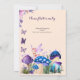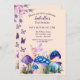 Fairy Wonderland Invitation : Transformez l'anniversaire de votre fille en un pays féerique des merveilles avec nos invitations charmantes! Le design comprend des champignons violets et bleus, une fée, et des papillons aux fleurs violettes contre un arrière - plan rose clair. Des détails personnalisables assurent une touche personnelle, et le mélange de polices de script et sans serif ajoute une élégance fantaisiste. Sur le dos, on peut lire "S'il vous plaît tournez-vous à côté" avec de l'espace pour plus de texte, invitant les invités à se joindre à la célébration magique. Prenez la magie - recevez vos invitations sur le thème de la fée aujourd'hui!
