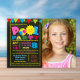 Invitation à la fête de la fille avec du texte coloré et une bordure sur un arrière - plan de tableau de bord. Cette invitation ludique et festive à la piscine est facilement customisée pour votre événement en ajoutant simplement votre photo et les détails de l'événement.