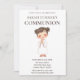 Célébrez la journée spéciale de votre fille avec cette belle invitation à la Première Communion, avec une illustration d'une fille souriante dans une robe de communion classique. Ce design élégant et chaleureux est parfait pour inviter famille et amis à se joindre à la célébration sacrée. Customisez facilement avec le nom de l'honoré, les détails de l'événement et un message personnel pour créer un gardien unique pour cette étape importante