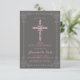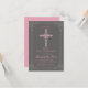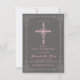 Cette première invitation de communion sainte élégante et classe présente une croix dessinée de rose et de blanc avec une bordure détaillée assortie. Parfait pour l'occasion religieuse spéciale de votre fille, le texte et la couleur arrière - plan peuvent être customisés à votre goût.