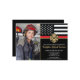 This design features a firemen's flag with black and white stripes, and a thin red line stripe as well. A fireman's badge sits above all of the party details for the graduating firefighter, which is next to a picture of the new fire academy graduate.