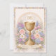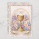 First Holy Communion, Eucharistic devotion, and sacred celebration are beautifully reflected in this traditional design centered on the Most Blessed Sacrament. A radiant golden chalice bearing the Holy Cross stands beneath the Sacred Host marked with the holy monogram IHS, surrounded by a gentle arrangement of pastel florals in soft spring tones. The inscription O Sacrament Most Holy proclaims love and reverence for Our Eucharistic Lord.
