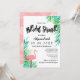 Belle invitation à la douche nuptiale avec flamant et verdure, dessinée à la main et remplie d'aquarelle imprimée. Le dos est assorti d'un motif en feuille tropicale rose et blanc.