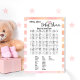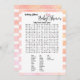 Doux, aquarelle, corail de pêche girly et rayures blanches arrière - plan. Joli, rose, flamant au milieu du script "Baby shower". Modèle créé juste pour vous sur ce Baby Name Word Search Game, avec des mots liés aux bébés pour que vos invités à rechercher et trouver.