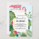 Une invitation d'anniversaire avec un flamant rose mignon et fantaisiste. Entouré de feuilles tropicales vertes et de fleurs d'hibiscus rouges. Un cadre dégradé or carré au centre.