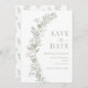 Offrez-vous un raffinement grâce à nos invitations rustiques raffinées Save the Date, avec une délicate couronne de feuilles vert poussiéreux entrelacée de fleurs blanches. Elevez l'anticipation pour votre mariage avec cette invitation unique et particulière.