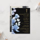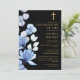 Cette élégante invitation noire et or à fleurs bleues pour une célébration chrétienne de la vie et de la mémoire peut être personnalisée avec vos informations en typographie classique et une photo de votre proche au verso. Conçu par Thisisnotme©