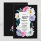 Une invitation à la fête du 100e anniversaire colorée et bordée de noir, avec des fleurs roses et violettes, des marguerites blanches et de la verdure entourant le texte.