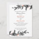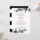 Élégante feuille et fleur inspiré mariage Répétition Dîner design avec une délicate branche de feuillage en noir, rose gris et corail sur un arrière - plan blanc. Les cartes sont retournées à une bande noire et blanche. Un design moderne et classe pour des mariages chics et élégants pour toute saison. Coordonner à la collection de mariages en fleur de lune.