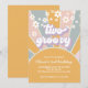 Invitation pour un premier anniversaire inspirée de Retro Sunshine avec des marguerites de style années 70 et des polices et couleurs bohèmes.