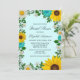 Invitation à la douche nuptiale rustique avec des tournesols vibrants, des marguerites blanches traditionnelles et des fleurs turquoises contre un arrière - plan d'aqua clair avec l'haleine du bébé et des accents de verdure botanique