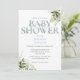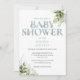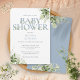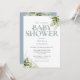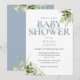 Une élégante invitation à une baby shower avec une typographie élégante poussiéreuse bleue et un beau feuillage botanique. Conçue par Thisisnotme©