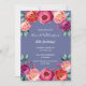Une carte d'invitation élégante pour une fête d'anniversaire de 50e (ou tout âge). Avec des fleurs couleur rose vif, violet et or rose, couleur aquarelle, fleuris comme décoration. Un arrière - plan bleu branché. Le nom est écrit avec un script de style écrit à la main.