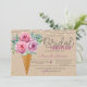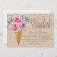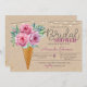Invitation à la douche nuptiale avec cône de crème glacée rempli de bouquet de fleurs roses rousses et de feuilles verdoyants, et points de parties scintillant rose.