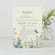 Invitations amis et famille pour célébrer l'arrivée d'un bébé doux avec cette élégante invitation fleur sauvage de printemps baby shower, avec des fleurs sauvages d'aquarelle dans les teintes de bleu crépusculaire et vert verdoyant.