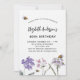 Un arrière - plan blanc. Décoré d'abeilles et de fleurs sauvages peints dans le violet et le rose. Personnalisez et ajoutez un nom et des détails du parti.