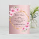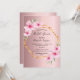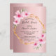 Une élégante invitation à la nuptiale tropicale estivale. Avec un cadre géométrique en faux or décoré d'hibiscus rose pâle, fleurissent des fleurs tropicales avec un peu de verdure. Un faux arrière - plan métallique rose vif. Le nom de la mariée à être est écrit avec un script de style manuel moderne. Texte noir. Dos : arrière - plan métallique rose faux.