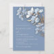 Cette élégante invitation de mariage présente des fleurs blanches en trois dimensions créées par IA, bleues et dorées sur un fond bleu poussiéreux.