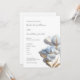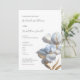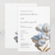 Cette élégante invitation de mariage minimaliste artistique présente des fleurs contemporaines blanches en trois dimensions bleu et or.