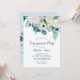 Cette invitation classique à la fête de fiançailles aux fleurs blanches est parfaite pour un événement de printemps. L'élégante décoration florale est composée de roses blanches et d'ivoire, de pivoines et de chrysanthèmes, avec des touches de fleurs d'aquarelle bleu périvent et de feuillage vert.