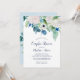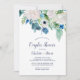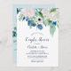 Cette invitation classique aux douches en couple de fleurs blanches est parfaite pour une douche de mariage printanière. L'élégante décoration florale est composée de roses blanches et d'ivoire, de pivoines et de chrysanthèmes, avec des touches de fleurs d'aquarelle bleu périvent et de feuillage vert.
