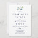 Ce faire-part de mariage monogramme aux fleurs blanches classiques est parfait pour un mariage de printemps. L'élégant design floral présente des roses et des pivoines blanches et en ivoire doux, avec des touches de fleurs d'aquarelle bleu périvent et de feuillage vert.