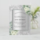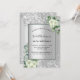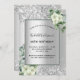 Faux arrière - plan de couleur argent décoré de fleurs blanches, de fleurs, de verdure d'eucalyptus et de parties scintillant faux argent, scintille. Personnalisez et ajoutez votre nom et les détails de votre fête. Lettres noires.