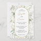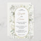 Fleurs blanches luxuriantes et Invitation Feuille d'or. Une invitation élégante qui combine la simplicité des fleurs blanches avec l'allure des détails géométriques en or, parfait pour les mariages et les occasions spéciales qui demandent une touche de beauté et de grâce", il est facile de customiser pour correspondre à vos couleurs mariages.