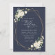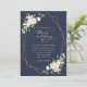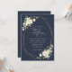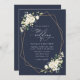 Invitations amis et famille dans le style et donner le ton pour votre journée spéciale avec ce faire-part de mariage charmant. Le design présente des fleurs d'aquarelle blanche, de la verdure et un cadre doré sur arrière - plan bleu marine.