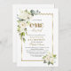 Elégant design de carte avec aquarelle délicate fleurs crème blanche et feuilles verts, un cadre faux or, une fausse croix d'or, script moderne faux or "ONEderful", sur un arrière - plan blanc. Utilisez l'outil Personnaliser pour ajouter vos informations, modifier les polices, les couleurs de la police. Pour les articles correspondants, s'il vous plaît, visitez mon Baptême et 1er Anniversaire Collection de fête.