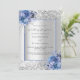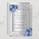 Faux silver looking background decorated with blue roses, flowers and confetti. Personalize and add your names and wedding details. Black letters.