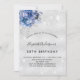 Pour un 18e anniversaire élégant (ou tout âge). Un fond métallisé argenté élégant et stylé. Décoré de poussière de paillettes et de fleurs bleues. Personnalisez avec un nom, un âge et les détails de la fête. Le nom est écrit avec une écriture manuscrite stylisée.