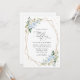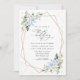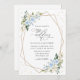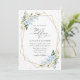 Invitations amis et famille dans le style et donner le ton pour votre journée spéciale avec ce faire-part de mariage charmant. Le design présente des fleurs d'aquarelle bleu et blanc, de la verdure, des confettis dorés et un cadre doré sur un arrière - plan blanc.