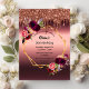 Sur le devant : Une invitation pour une fête d'anniversaire de 30e (ou tout âge). Arrière - plan faux métallique de couleur bordeaux avec un cadre géométrique en faux or. Décoré de fleurs violettes foncées et bordeaux, de plumes roses et boho. Faux parties scintillant en bronze goutte à goutte. Modèles pour un nom et les détails de la fête. Le nom est écrit avec un script de style écrit à la main, des lettres de couleur noire. Dos : arrière - plan faux métallique de couleur bordeaux