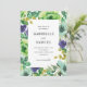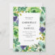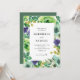 Cette faire-part de mariage colorée est bordée de fleurs et de verdure turquoises, vertes et violettes. L'arrière est vert sauge foncé.