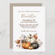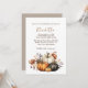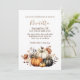 Cette élégante invitation personnalisée présente un thème floral automne avec des citrouilles. Une aquarelle de quatre citrouilles de couleur différente est placée en bas. Elles sont agrémentées d'un bouquet de fleurs séchées aux belles couleurs d'automne. Il est parfait pour une douche nuptiale, fête d'anniversaire, mariage, ou toute autre fête d'automne confortable.